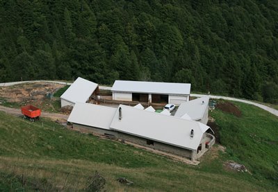 The Alpine farm is located inside a doline, a karstic depression called "fossa" in the local dialect. Under the new facilities the remains of the old buildings can still be discerned. The natural or man-made water pool is called "lama". The entire district is marked by these small hollows with impermeable bottoms where rain water and melting snow gather.