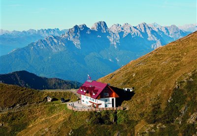 La Zollnersee Hütte dell’Alpenverein si trova nel cuore di splendidi pascoli distesi tra il Passo di Monte Croce Carnico e Nassfeld, direttamente sul confine italiano. È una tappa fissa per gli escursionisti di lunga percorrenza sull’Alta Via Carnica e per i visitatori in giornata provenienti dalla regione. Difatti, l’area del Zollnersee è consigliabile a piedi, mountainbike o in auto, anche per le famiglie con bambini. Il nome deriva dal vicino lago raggiungibile direttamente dal rifugio, attraverso dolci paludi. Nel 2015 la regione con tutti i suoi geotrail è stata riconosciuta come geoparco mondiale dell’UNESCO. Il Zollner è la meta ideale per un viaggio nel tempo del Paleozoico, senza dover sfogliare tra libri polverosi di geografia. Nel 2018 la Zollnersee Hütte stessa è stata insignita di un ulteriore riconoscimento: è la prima baita Slow Food Travel dell’intera dorsale principale delle Alpi. Vi vengono serviti gustosi prodotti regionali dei contadini e produttori locali! I residenti consigliano l’escursione di un giorno attraverso il Zöllnertörl fino al Rifugio Fabiani. Dai monti di casa, Kleiner Trieb (Punta Medatte), Hoher Trieb (Cuestalta) e Findenig, si gode inoltre di una vista particolare sul paesaggio montano delle Alpi Carniche. Chi desidera pernottare alla Zollnersee Hütte può optare per il bivacco o una delle due camere doppie. Dopo una deliziosa colazione in malga, si può fare tappa alla Rosser Hütte che produce il noto formaggio Gailtaler Almkäse ed altri prodotti lattiero-caseari durante tutta l’estate. Altra tappa fissa è la Friedenskapelle (cappella della pace), gioiello architettonico eretto in memoria dei combattimenti della Prima Guerra Mondiale, meravigliosamente incastonato nel paesaggio.
